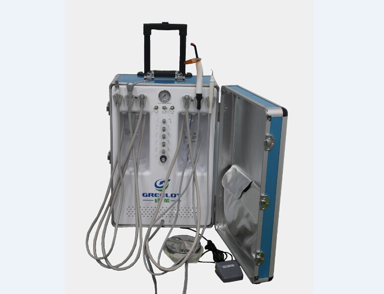 此款便携式牙科治疗机是一款可携带、功能齐全的牙科治疗设备。外形新颖、美观,外箱采用优质的铝合金材料,面板一体吸塑成型,重量轻且抗压、抗摔,所有治疗单元均可收纳在箱内,出诊时方便携带,外出口腔治疗的称心设备。